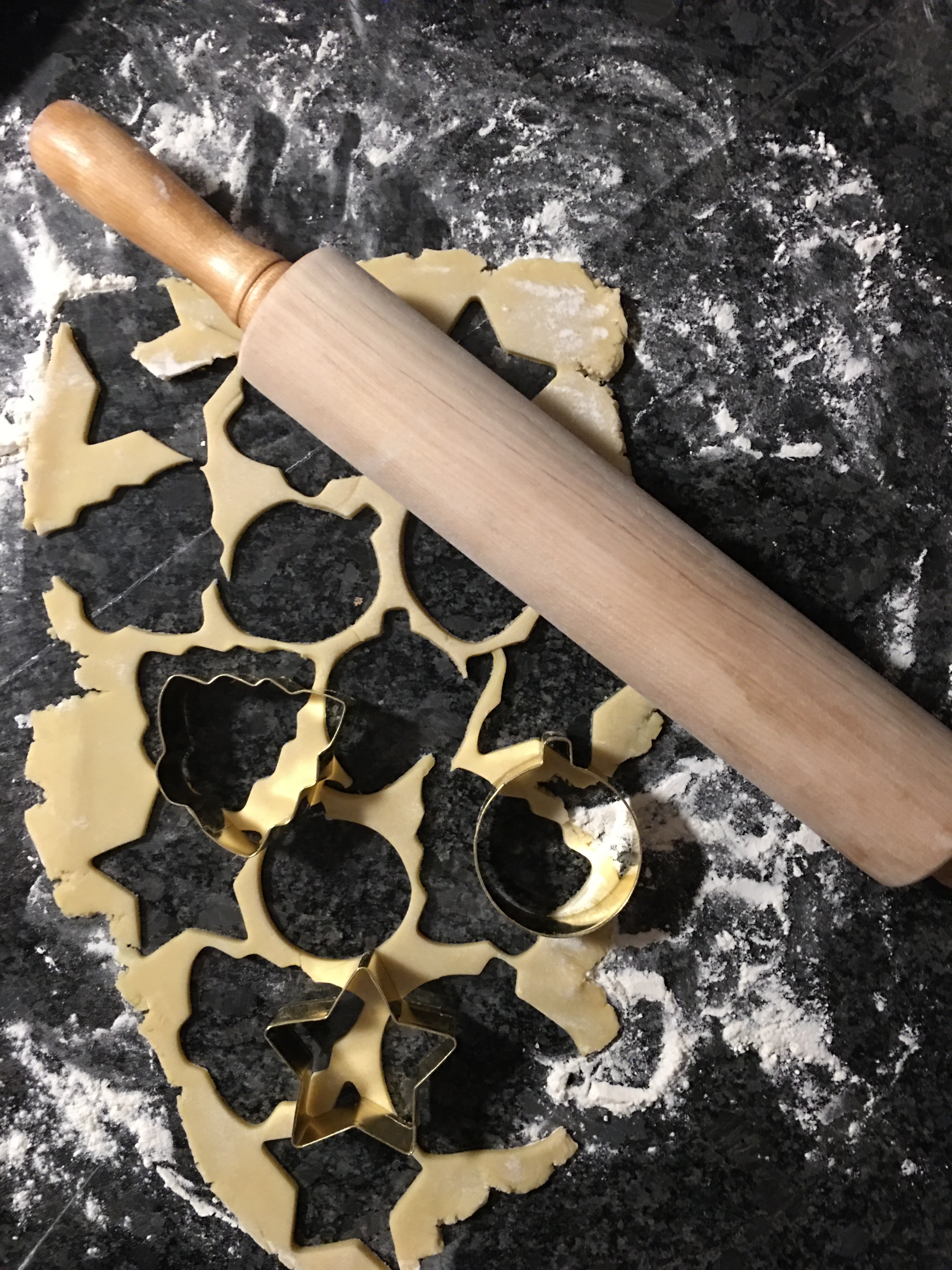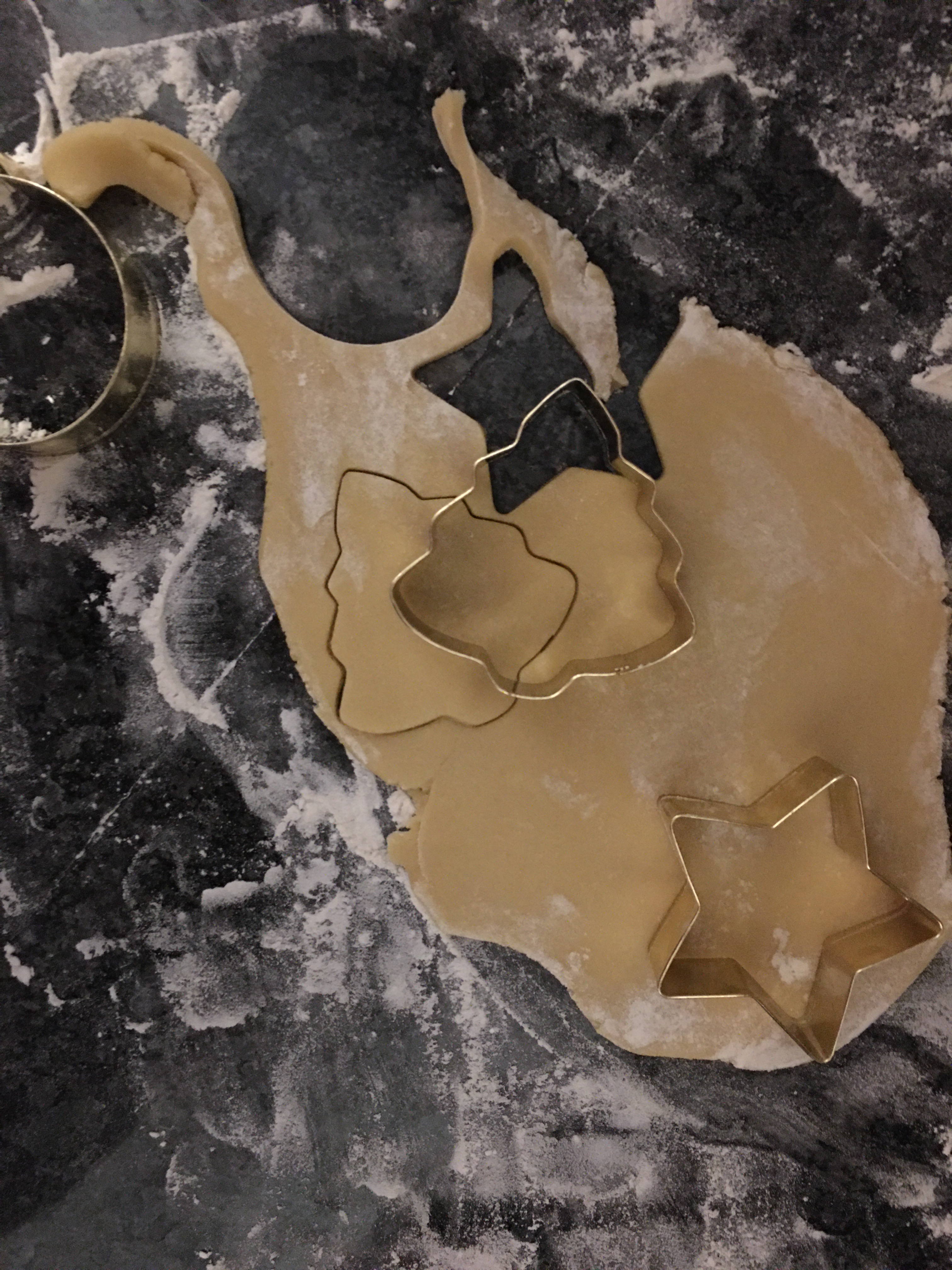 - Press out the cookies with your choice of cookie cutter and place them on a parchment paper lined cookie pan