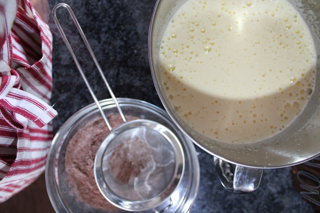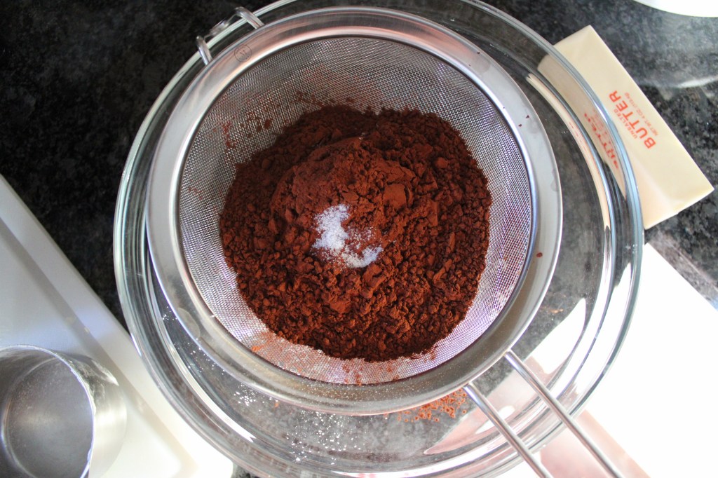 - Sift the flour, cocoa, baking powder, and salt together 3 times and set aside
