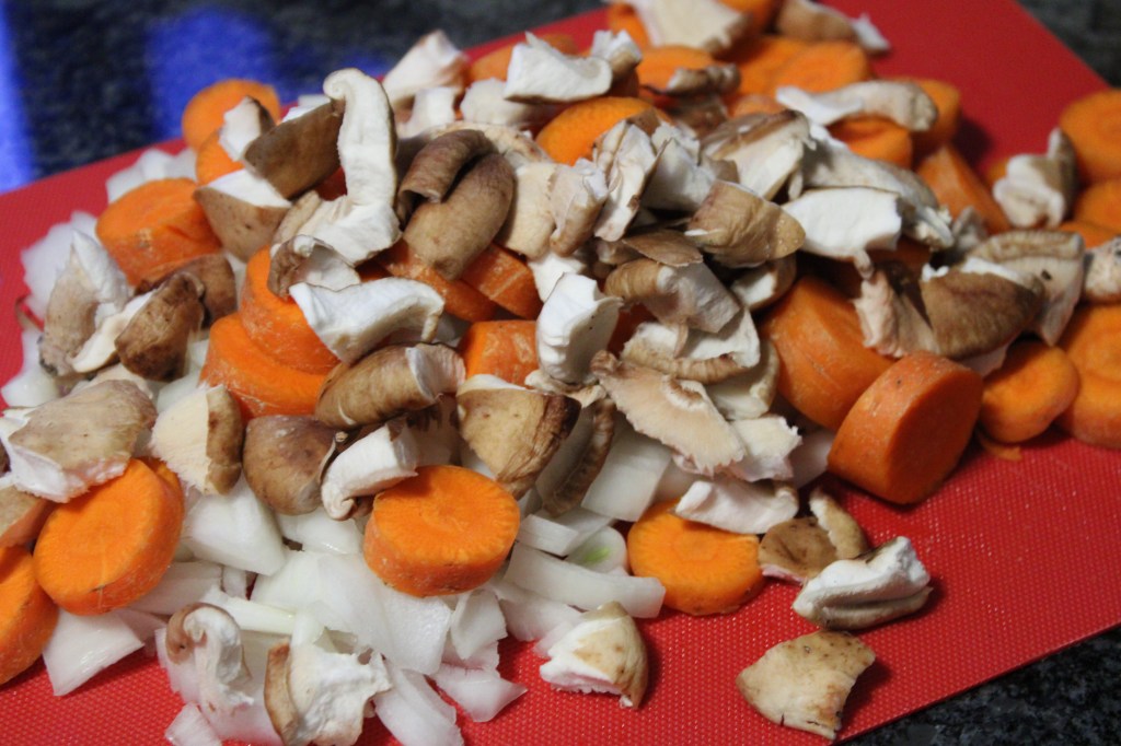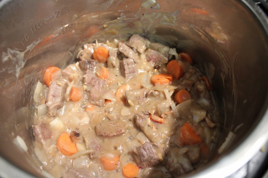 - Place the carrots, onion, and mushroom pieces now in the instapot and cover with the onion soup mix, stir and cook until the onions are sweaty.