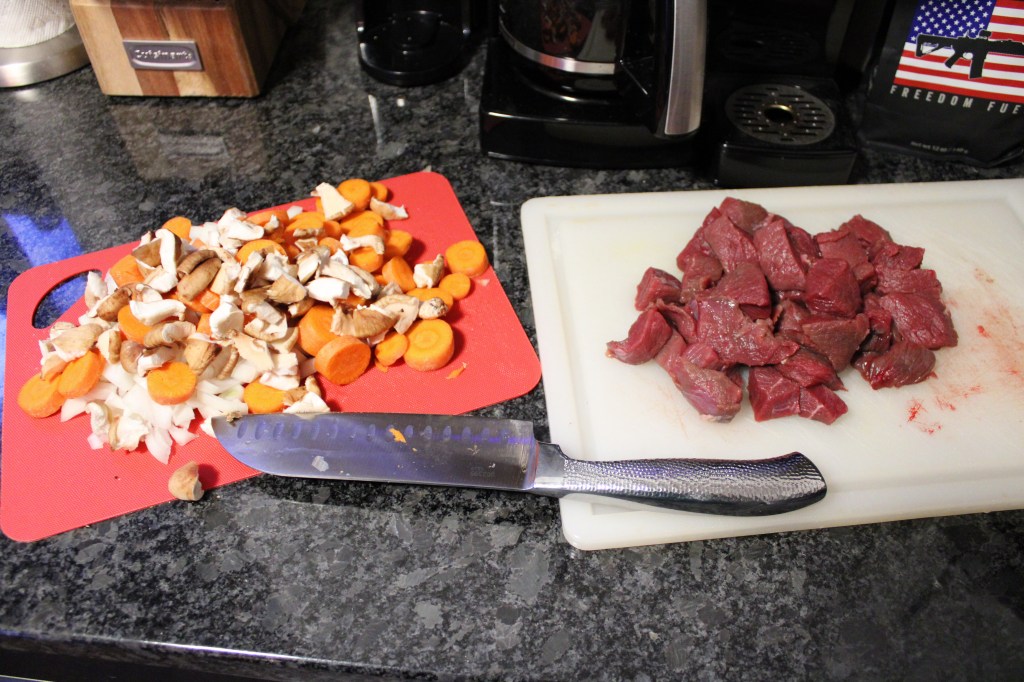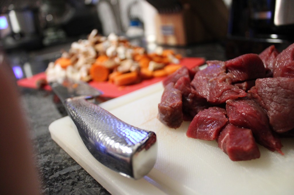 - 1.5 lbs of venison steak cut into 2″ cubes (any cut works, you can also use a different kind of meat if you’d like)